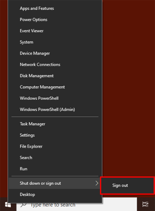 - To sign out of the virtual desktop, right-click on the Start Button and hover over Shutdown or Sign Out and click Sign out.